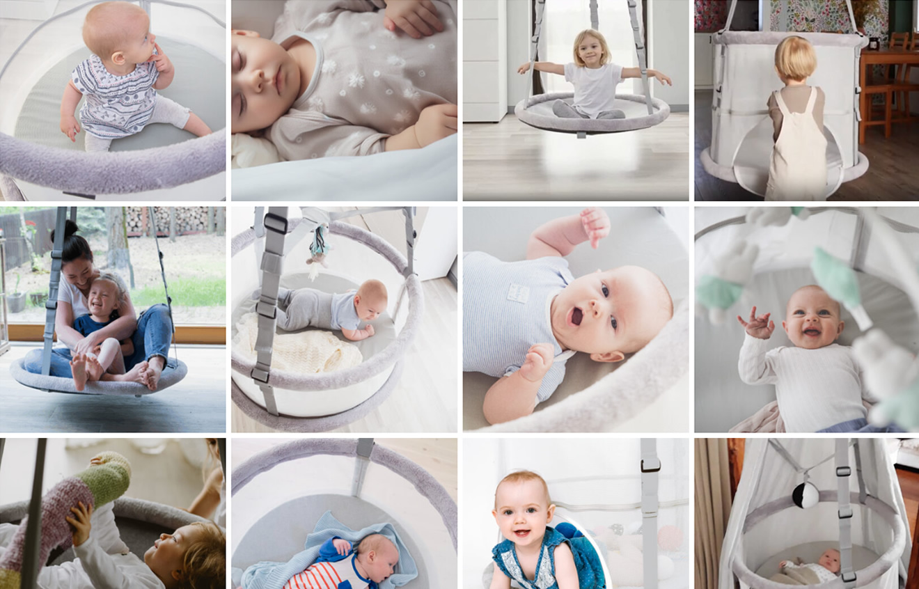 Jedna kołyska, trzy funkcje: najpierw bezpieczne miejsce do snu, później wiszący kosz do zabawy, a na koniec wytrzymała huśtawka dla starszaka — nawet do 12. roku życia.
